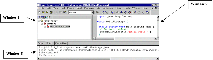 Under “Build” menu, select “Compile” if there are no errors, a message will be displayed in window 3 saying “file compiled… no errors”, You are